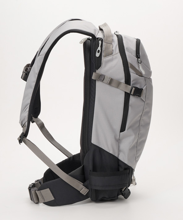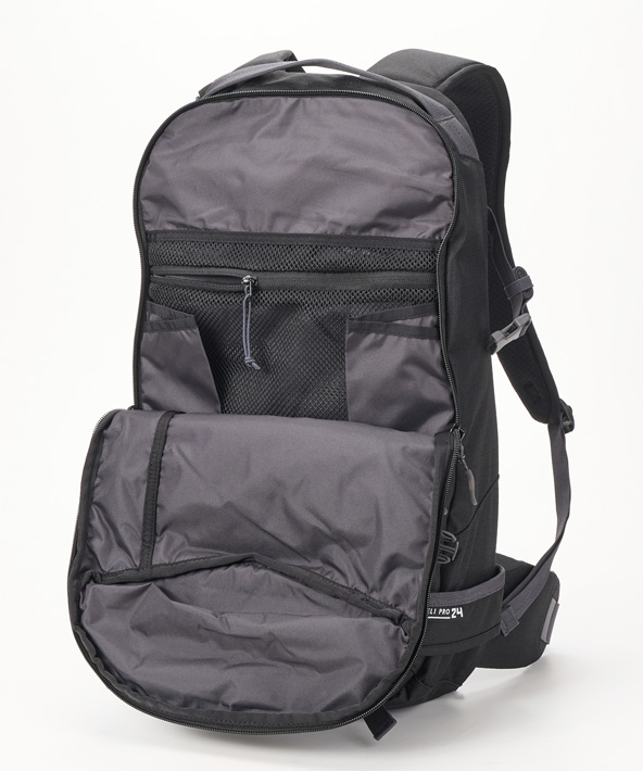 バックカントリーでの行動を想定した設計で、雪山で必要な装備をすっきり収納可能。