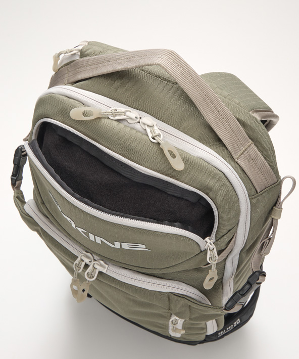 シャベルやプローブをすぐに取り出せる専用スリーブ、フリース裏地付きの大型ゴーグルポケット、