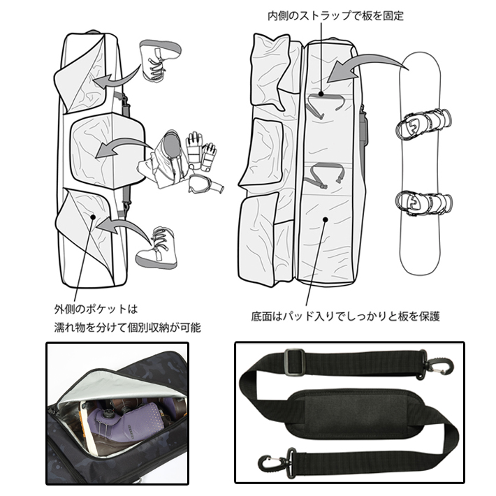 ・内側にはボードを固定する2本のストラップ付。