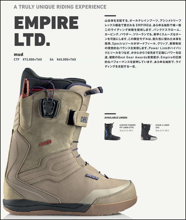 アシンメトリーフ レックス構造で愛される EMPIREは、あらゆる地形で唯一無二のライディング体験を提供します。