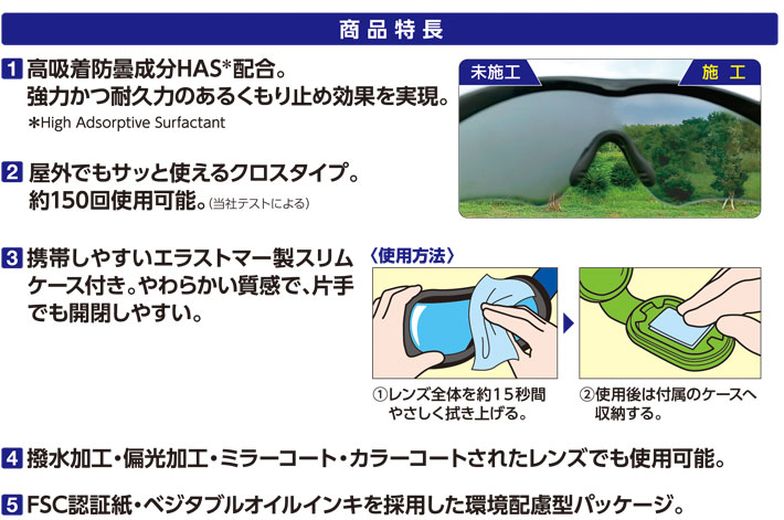 そこでスポーツ時の「レンズのくもり」が気になる方に撥水加工されたレンズへも対応したくもり止めクロスの登場です。