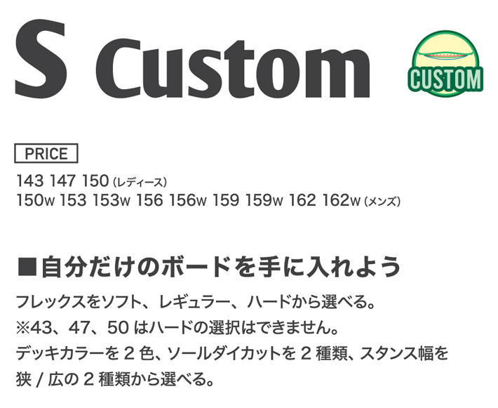 デッキカラーを2色、ソールダイカットを2種類、スタンス幅を狭/広の2種類から選べる。