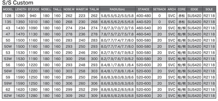 ショートバリアブルキャンバー(SVC)とはキャンバーの種類のひとつで、接雪点からノーズまたはテールにかけて緩やかに立ち上がるアーチ形状。
