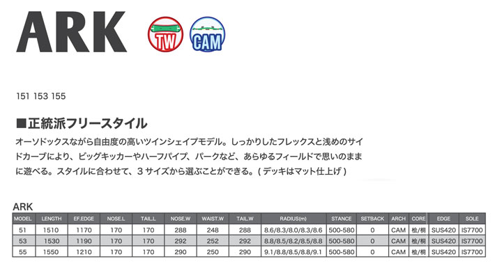 しっかりしたフレックスと浅めのサイドカーブにより、ビッグキッカーやハーフパイプ、パークなど、あらゆるフィールドで思いのままに遊べる。