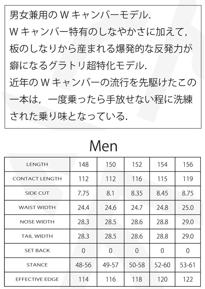W キャンバー特有のしなやかさに加えて、板のしなりから産まれる爆発的な反発力が癖になるグラトリ超特化モデル。
