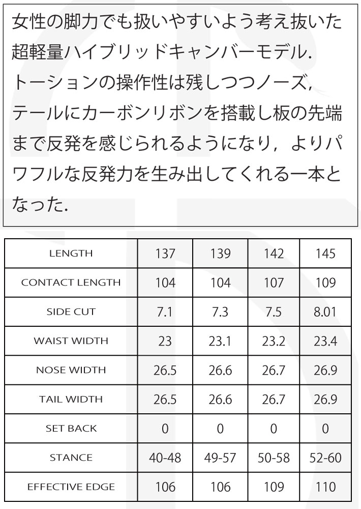 トーションの操作性は残しつつノーズ、テールにカーボンリボンを搭載し板の先端まで反発を感じられるようになり、よりパワフルな反発力を生み出してくれる一本となった。