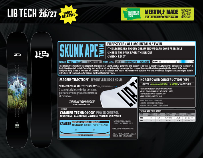 EARLY MODEL 26-27 LIB TECH リブテック スノーボード SKUNK APE TWIN 163W 166W メンズ 板 2026 2027