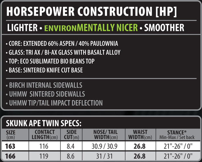 アウトラインは2016年までのSKUNK APEにそっくりですが、今回はキャンバーで完全なるツイン!ですが接雪長は少し短めにしてくれてる優しさも感じます!