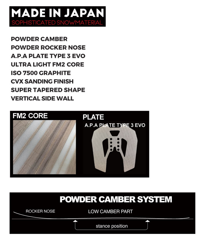 *フリースタイルブランドならではのパウダーボード設計は、高い浮力と滑走性能は無論のこと、動きにくいパウダー状況においても軽快な操作性を発揮します。