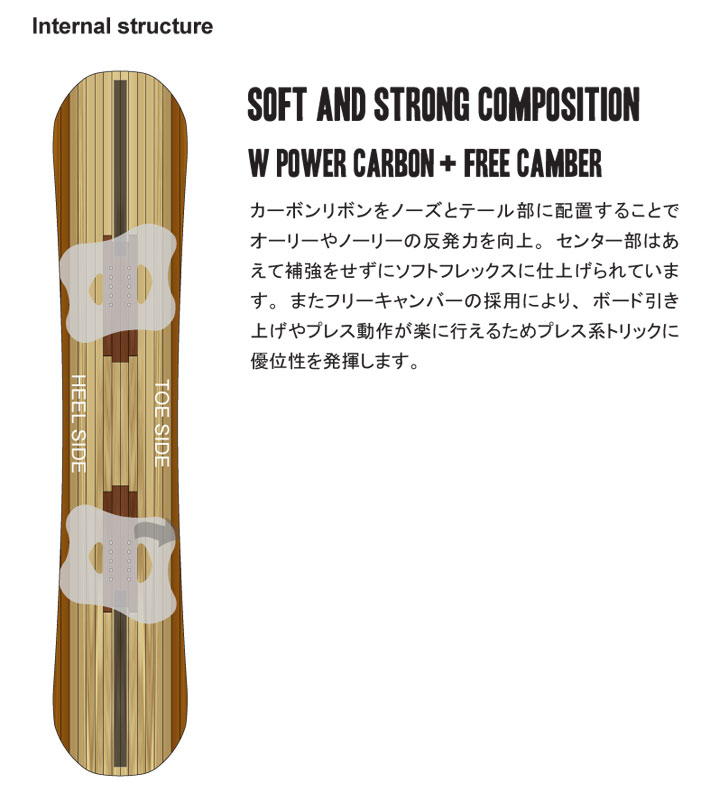 さらに反発力を向上させる補強材としてW POWER CARBON RIBBON 25Wを採用し、トリックの発動やオーリーに必要とされるスナップ力を強化。