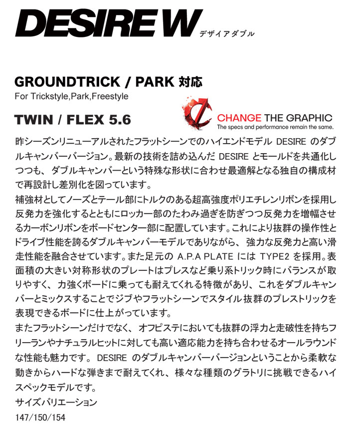 DESIRE のダブルキャンバーバージョンということから柔軟な動きからハードな弾きまで耐えてくれ、様々な種類のグラトリに挑戦できるハイスペックモデルです。