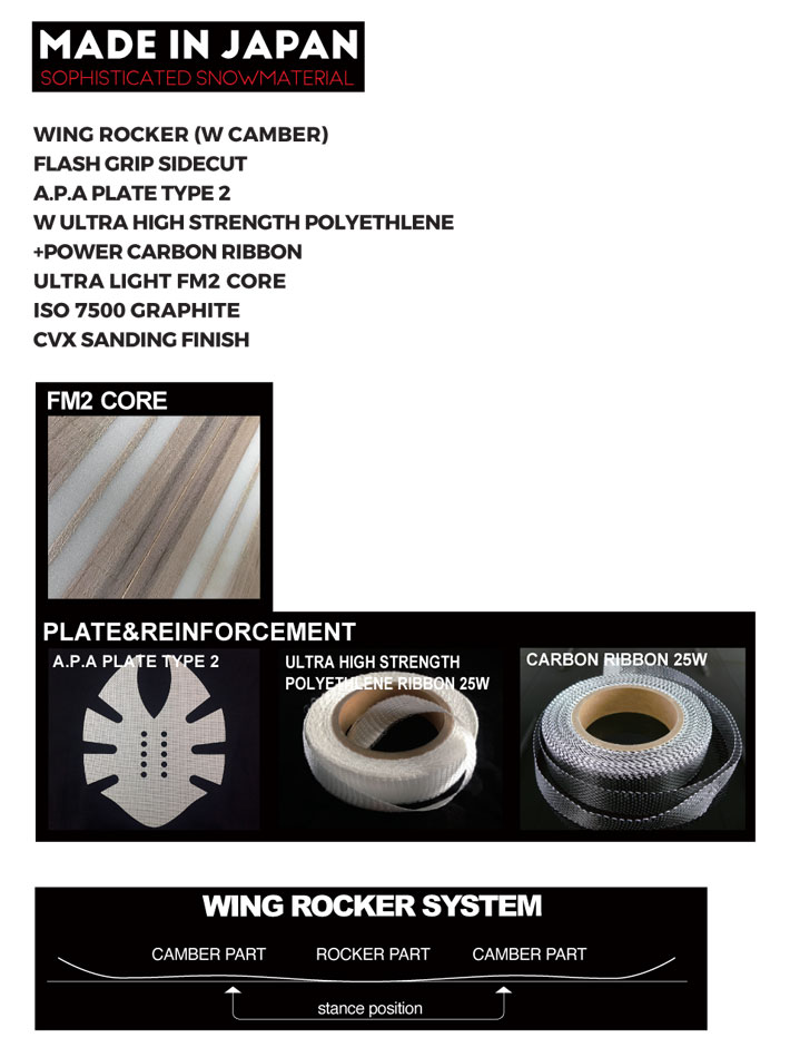 補強材としてノーズとテール部にトルクのある超高強度ポリエチレンリボンを採用し反発力を強化するとともにロッカー部のたわみ過ぎを防ぎつつ反発力を増幅させるカーボンリボンをボードセンター部に配置しています。