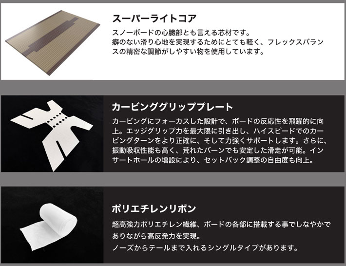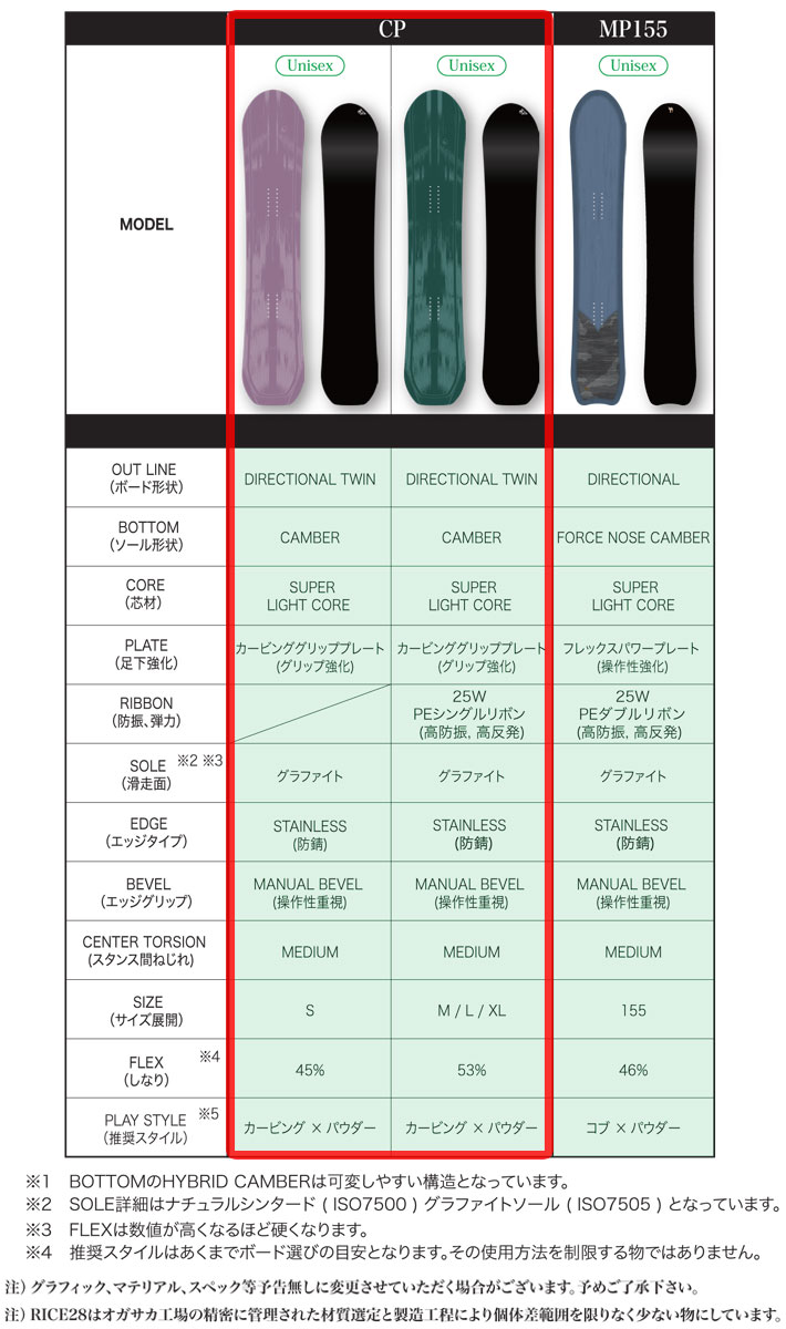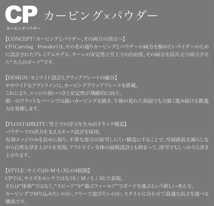 CP(Carving Powder)は、その名の通りカービングとパウダーの両方を極めたいライダーのために設計されたプレミアムモデル。