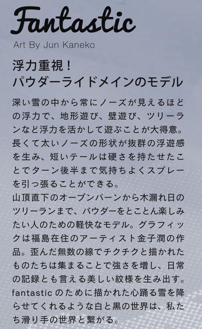 fantasticのために描かれた心踊る雪を降らせてくれるような白と黒の世界は、私たち滑り手の世界と繋がる。