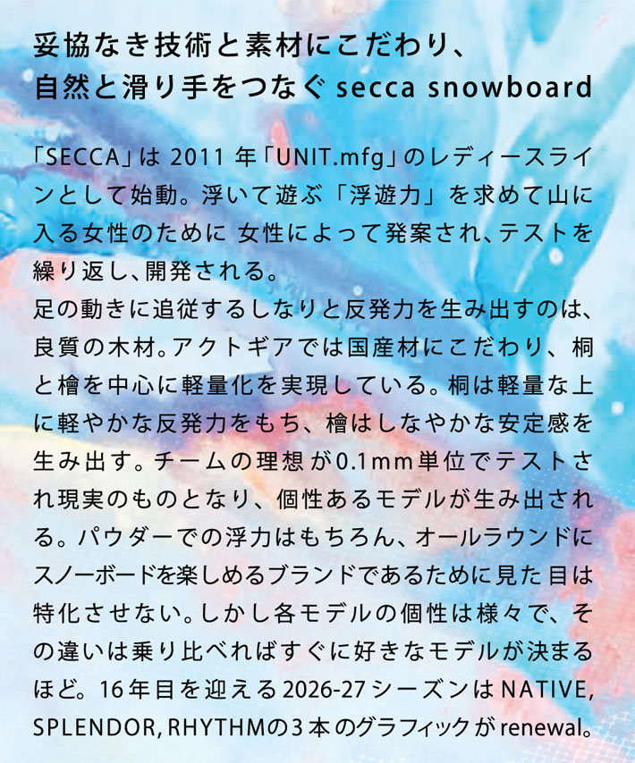 2011 年「UNIT.mfg」のレディースラインとして始動。浮いて遊ぶ「浮遊力」を求めて山に入る女性のために女性によって発案され、テストを繰り返し、開発される。