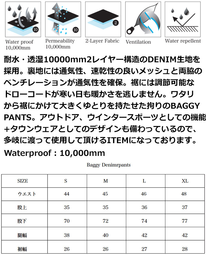 耐水・透湿10000mm2レイヤー構造のDENIM生地を採用。