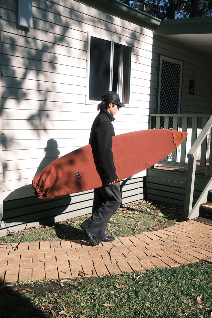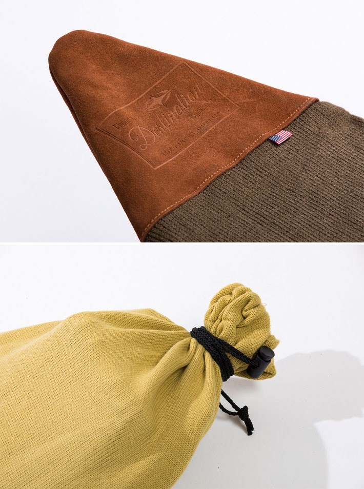 ノーズガードにレザーパーツをあしらい、染色がきれいに表現できるループニットを使ったハンドメイド・ボードソックス