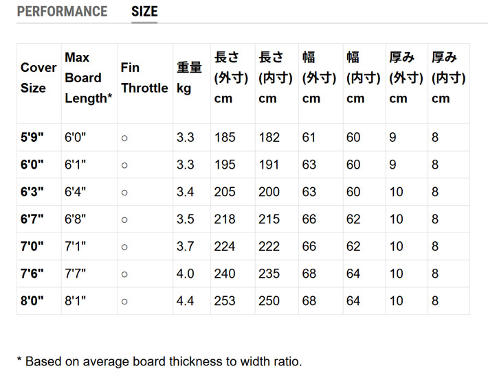※メーカー提供サイズです。お持ちのボードサイズや形状により、記載のサイズ内で収まらないサーフボードもある場合がございます。