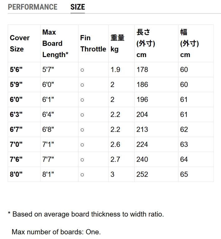 [メーカー提示対応可能サイズ]ボード長さ/5'9"(175.3cm)まで、ボード最大幅/56.9cmまで