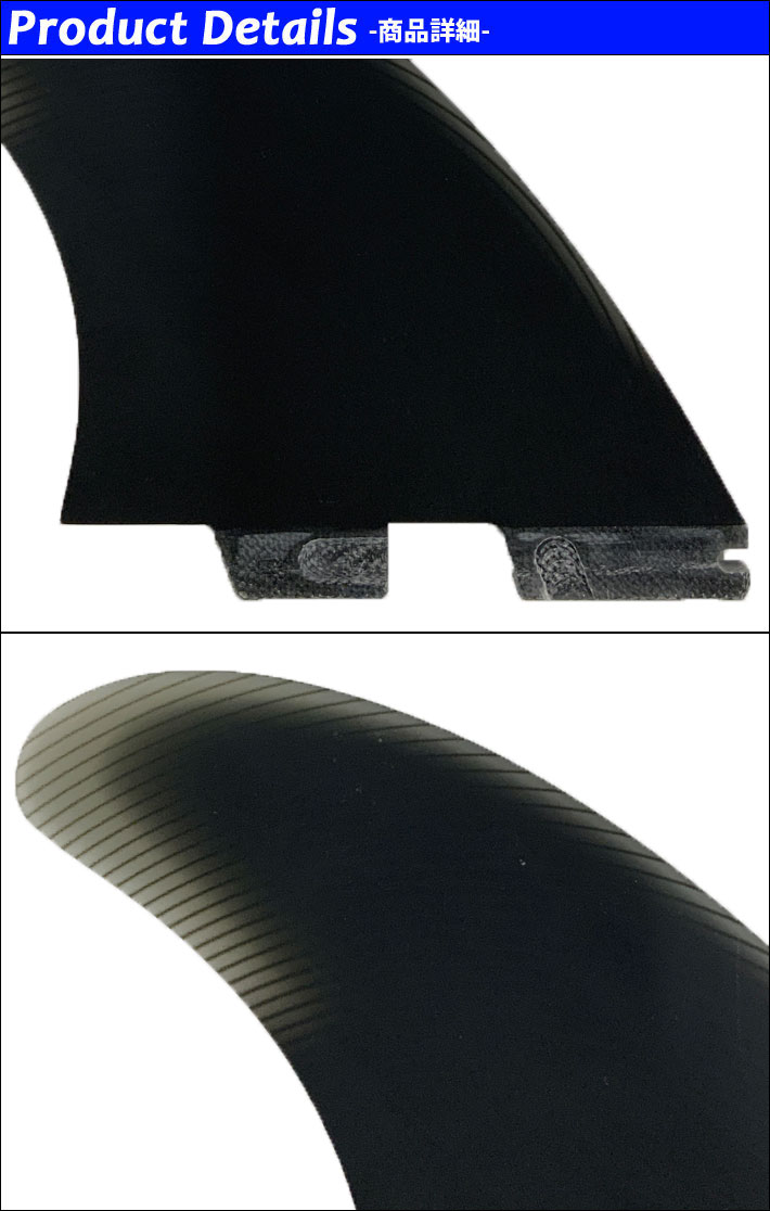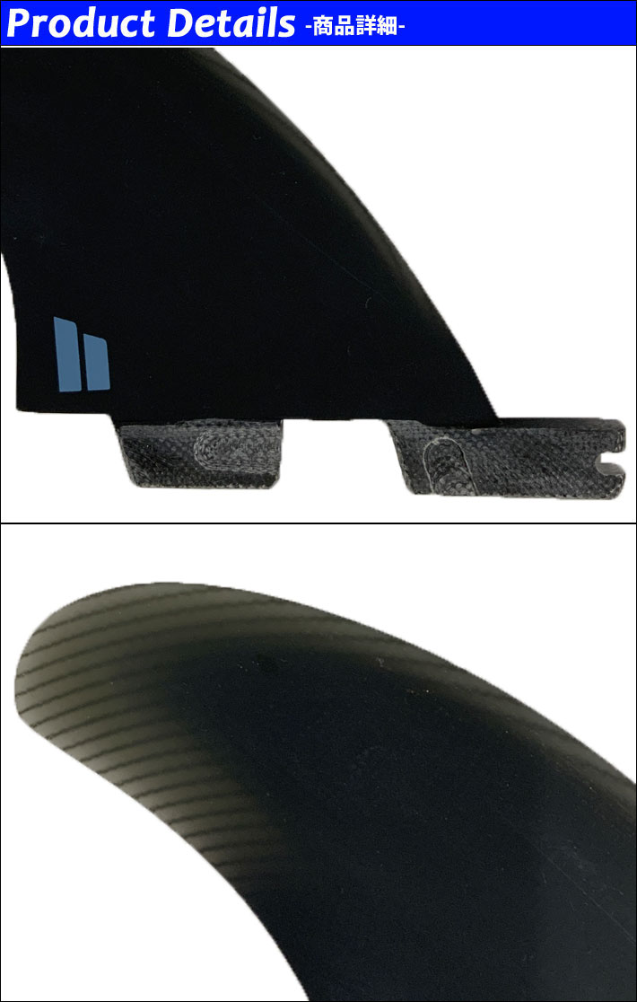 サイドフィンはS-Mサイズカテゴリの下端に位置し、ニュートラルなスイープアングル(Performer Family)とベースからティップにかけての流線型のアウトラインを持っています。