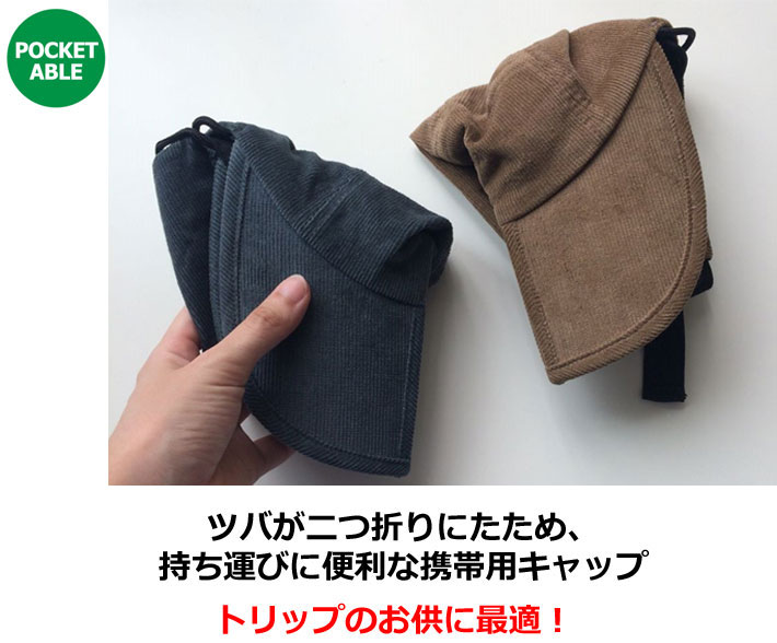 バが二つ折りにたため、持ち運びに便利な携帯用キャップのコーデュロイ仕様。