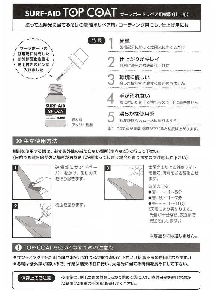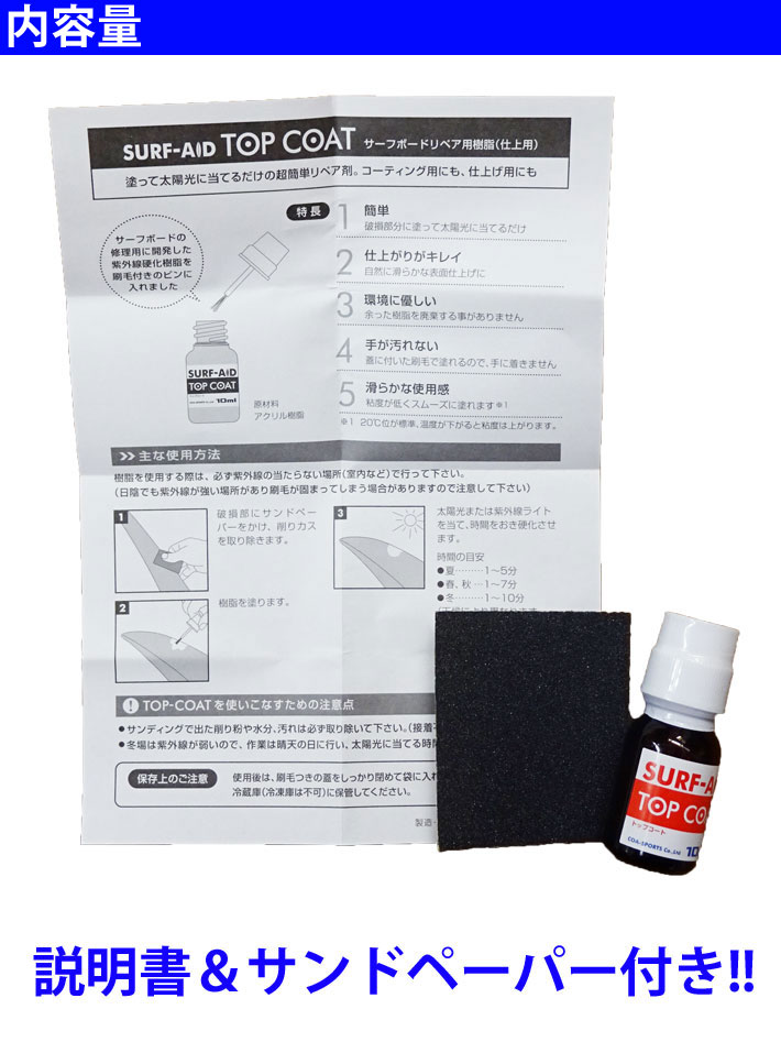 サーフボード リペア 仕上げ SURF AID TOP COAT サーフエイド トップコート 刷毛付きソーラーレジン ウレタン製&エポキシ製 PU,EPS 両方 使用可能 液体タイプ サーフィン サーフボード修理剤 [メール便送料200円対応]