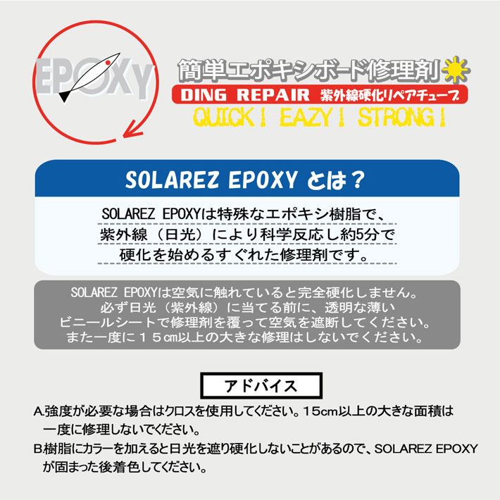SOLAREZ EPOXYは特殊なエポキシ樹脂で、紫外線(日光)により化学反応し約3分で効果をはじめる優れた修理剤。
