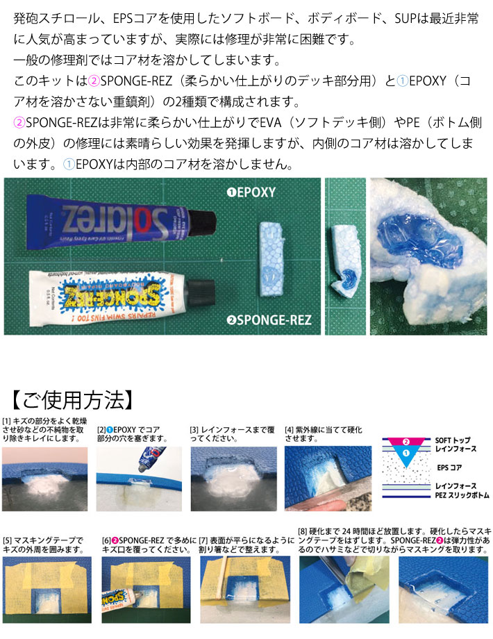 [2]SPONGE-REZは非常に柔らかい仕上がりでEVA(ソフトデッキ側)やPE(ボトム側の外皮)の修理には素晴らしい効果を発揮しますが、内側のコア材は溶かしてしまいます。