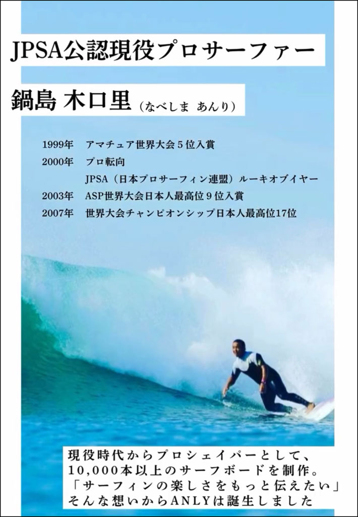 世界ランク9位のプロサーファー、鍋島木口里が手掛けるサーフブランド。