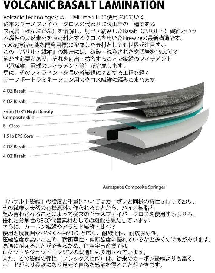 HeliumやLFTに使用されている従来のグラスファイバークロスの代わリに火山岩の一種である玄武岩(げんぶがん)を溶解し、射出・紡糸したBasalt(バサルト)繊維という不燃性の天然素材を原材料とするクロスを用いたFirewireの最新構造です。