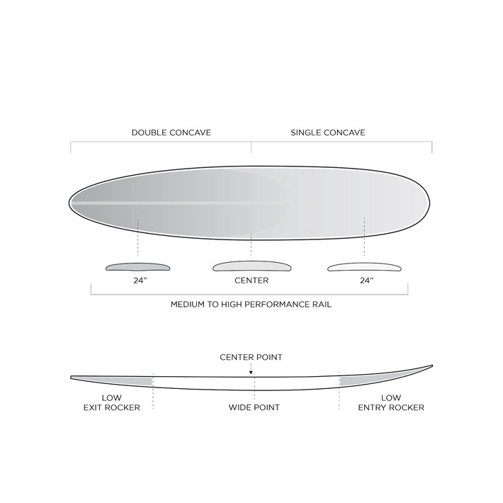 低めのエントリーロッカーが意味するのはパドルパワーの最大化であり、後方からでも波に滑り込む事を可能にします。