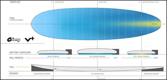 ボリュームプラスは、ハイボリュームでワイドなボードのトレンドをミッドレングスモデルに取り入れ、より長いボードのような安定性とパドル性能を備えながら、コンパクトでターンしやすいボードを実現しました。