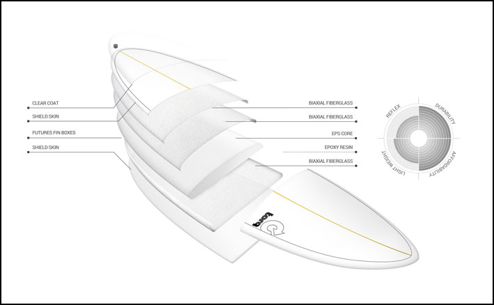Torq Epoxy Technologyは、軽量EPSコアと、2軸グラスファイバークロス、エポキシ樹脂、および独自のシールドスキンを組み合わせています。